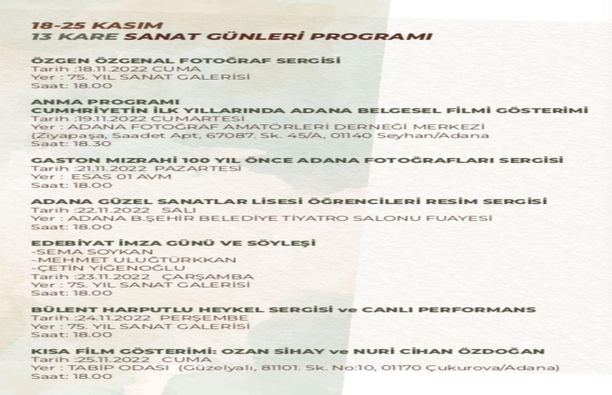 Adana Büyükşehir Belediyesi’nin desteklediği, AFAD, Adana Tabip Odası, Çukurova Üniversitesi, Alparslan Türkeş Üniversitesi, Altın Koza, Adana Büyükşehir Kent Konseyi’nin paydaş olduğu 13 Kare Sanat Günleri 18-25 Kasım tarihlerinde gerçekleştirilecek.