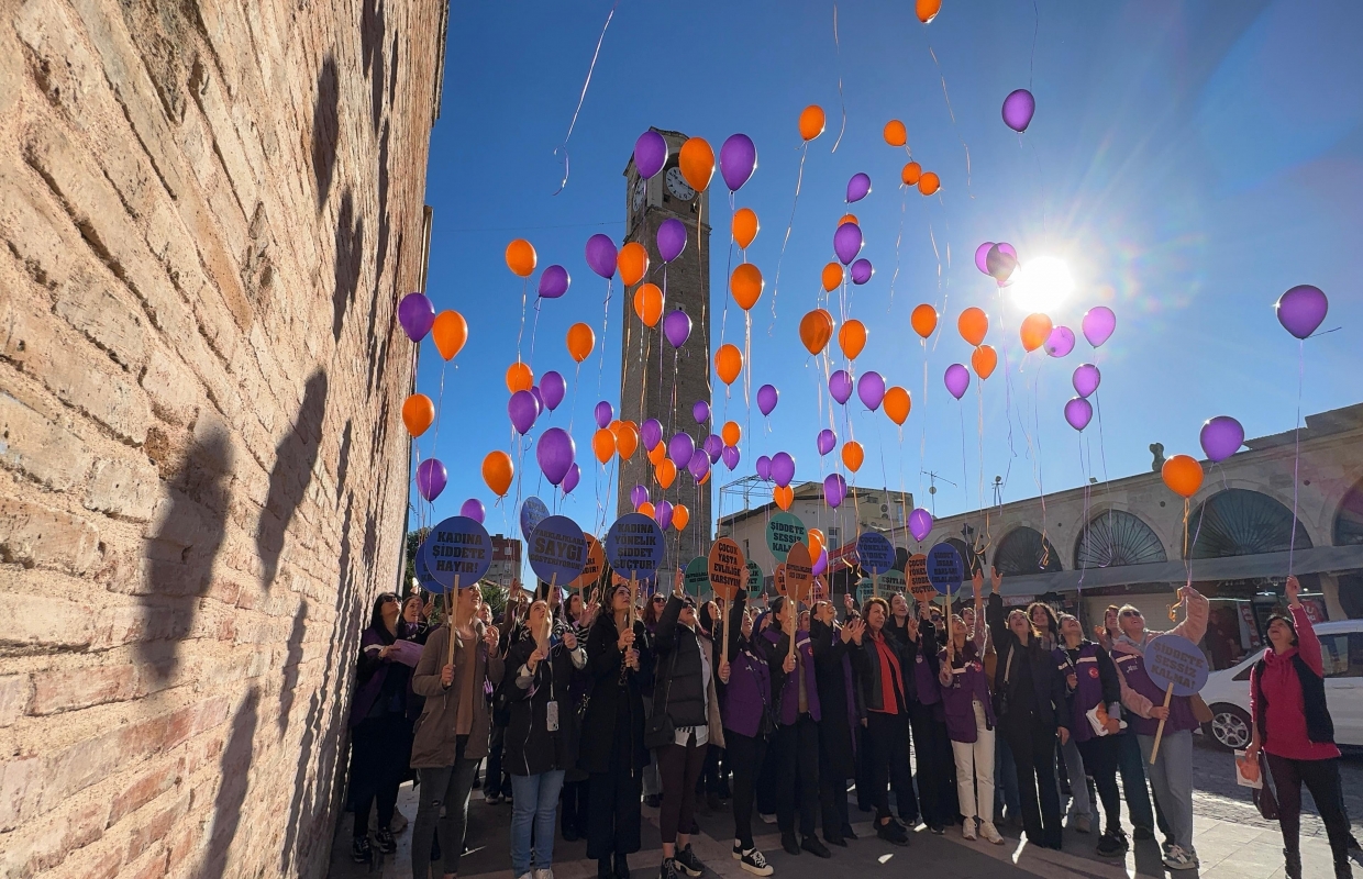 ve personel, mor ve turuncu balonları, “Şiddete Hayır” sloganı ile uçurdu,