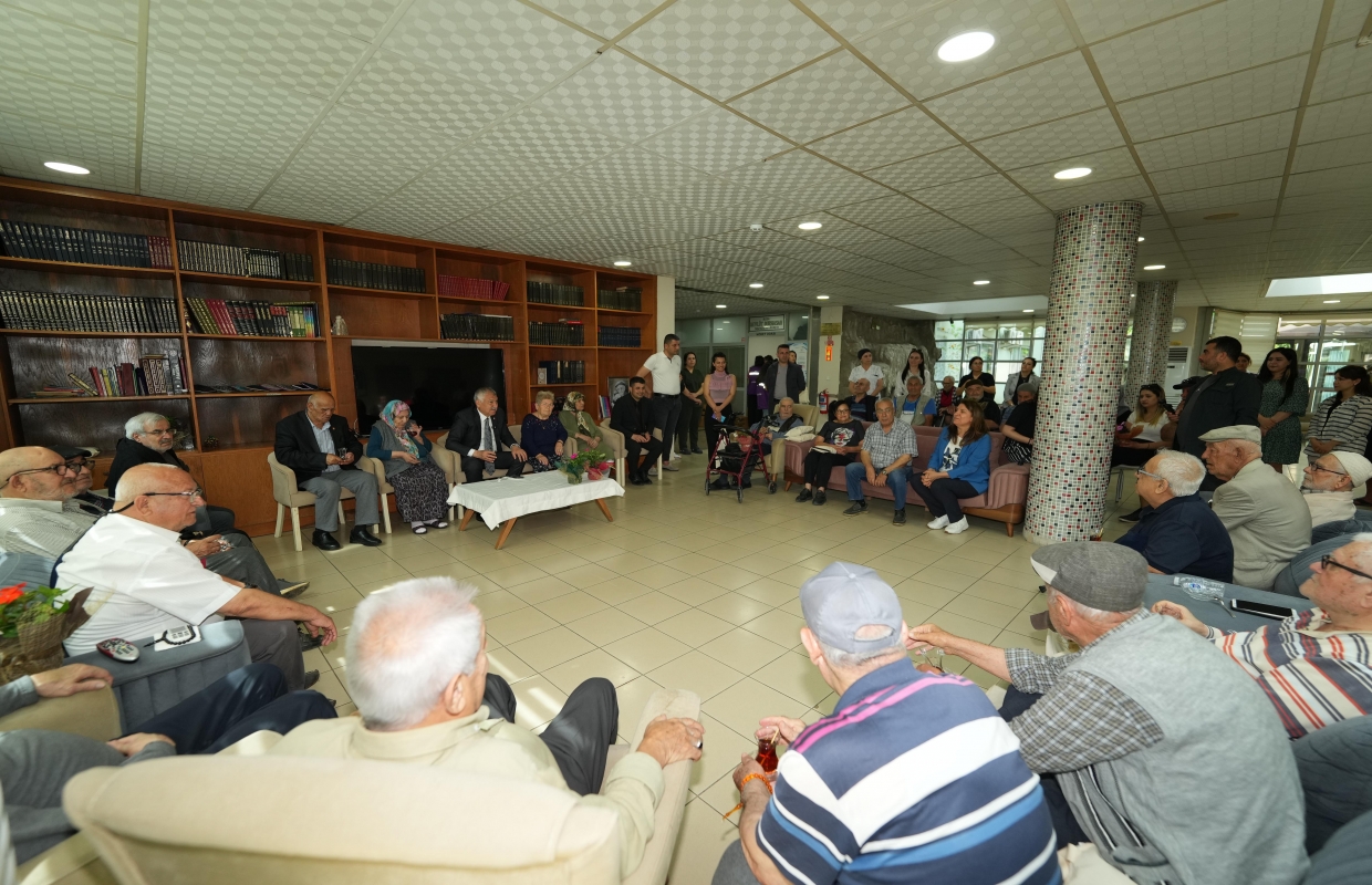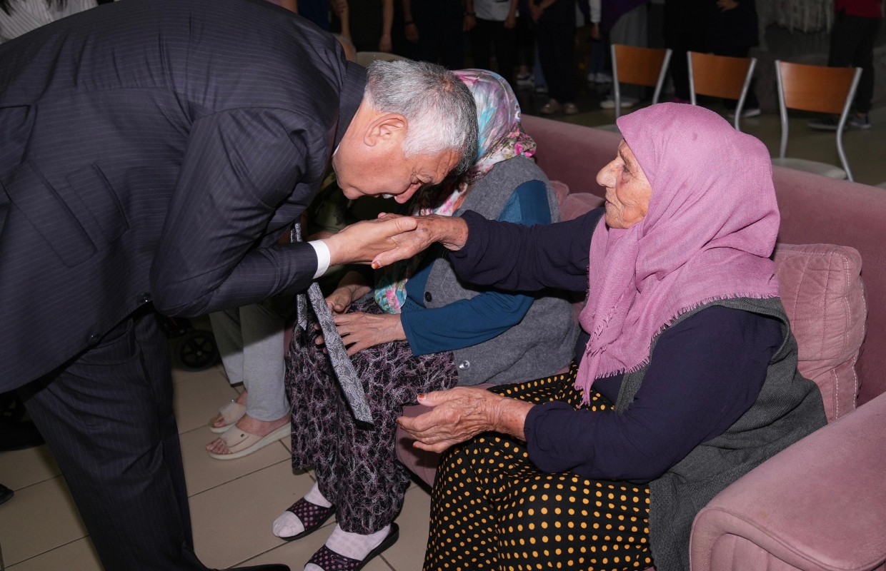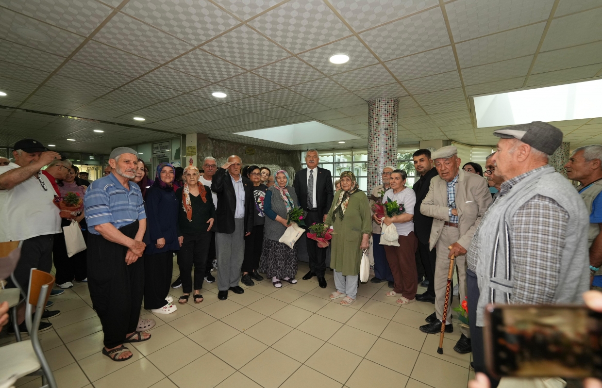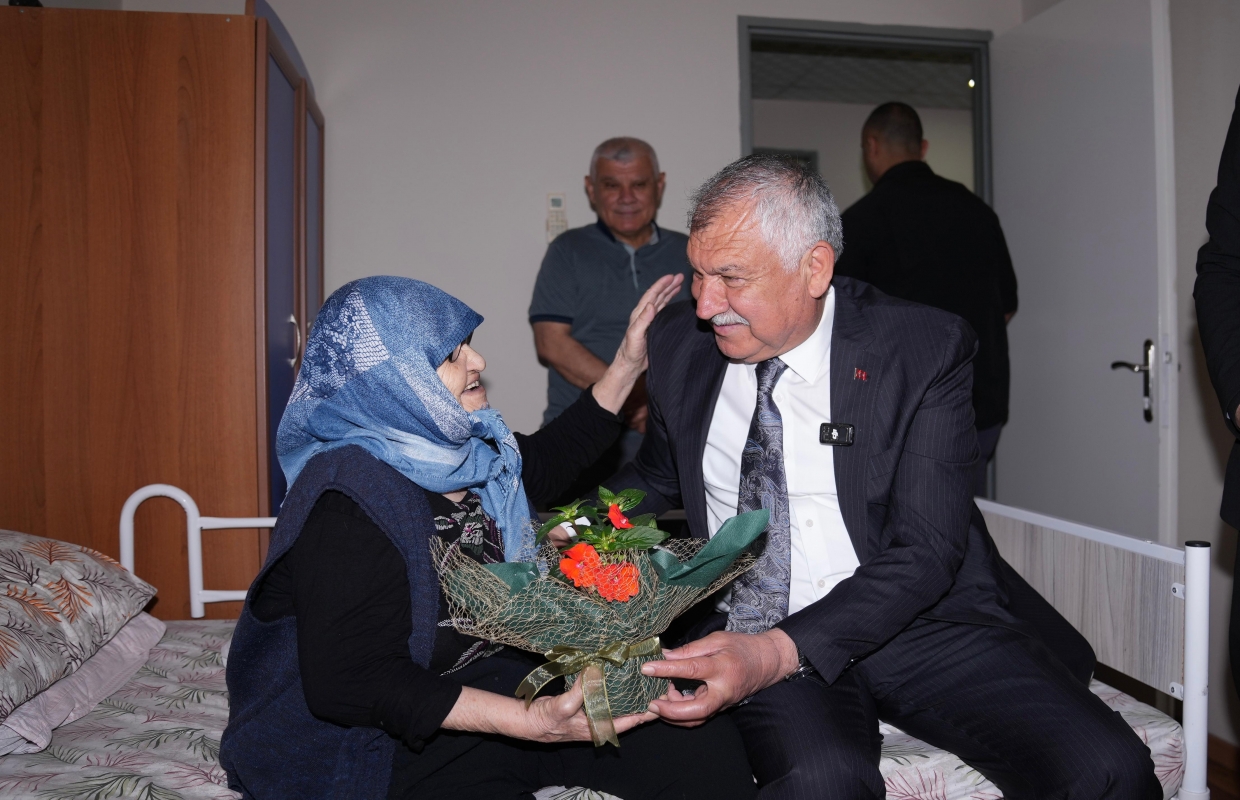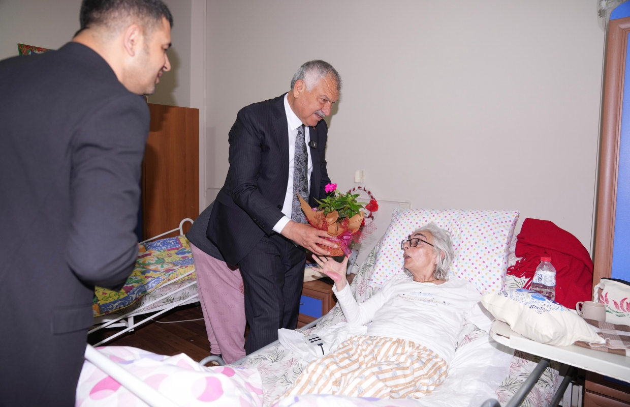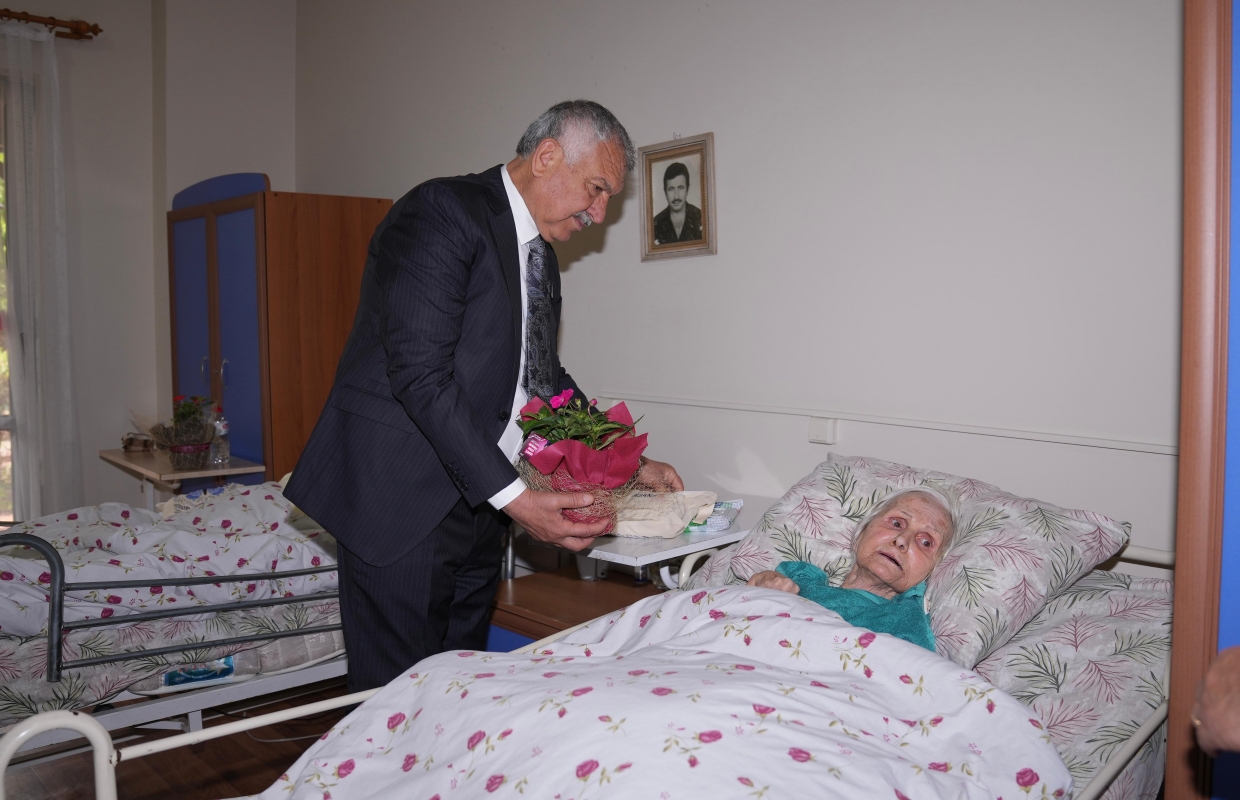 gerçekleştirilen anlamlı ziyarette, huzurevindeki kadınlara çiçek veren Başkan