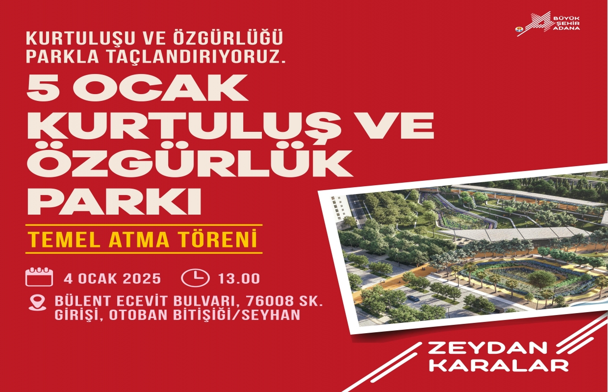 5 Ocak Kurtuluş ve Özgürlük Parkı’nın temel atma töreni 4 Ocak 2025 Cumartesi günü, Bülent Ecevit Bulvarı, 76008 Sokak Girişi, Otoban Bitişiği, Seyhan adresinde saat 13’te yapılacak.