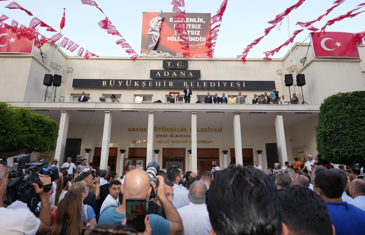 Adana Büyükşehir Belediye Başkanı Zeydan Karalar, belediye balkonundan
