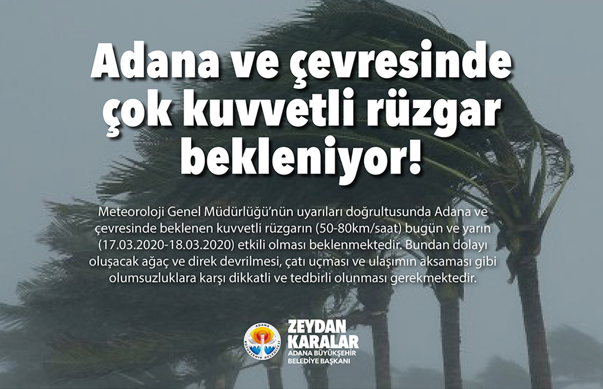 Meteoroloji Genel Müdürlüğü'nün Uyarıları doğrultusunda Adana ve Çevresinde beklenen kuvvetli rüzgarın (50-80 km/saat) bugün ve yarın (17.03.2020-18.03.2020) etkili olması beklenmektedir. Bundan dolayı oluşacak ağaç ve direk devrilmesi, çatı uçması ve ulaşımın aksaması gibi olumsuzluklara karşı dikkatli ve tedbirli olunması gerekmektedir.