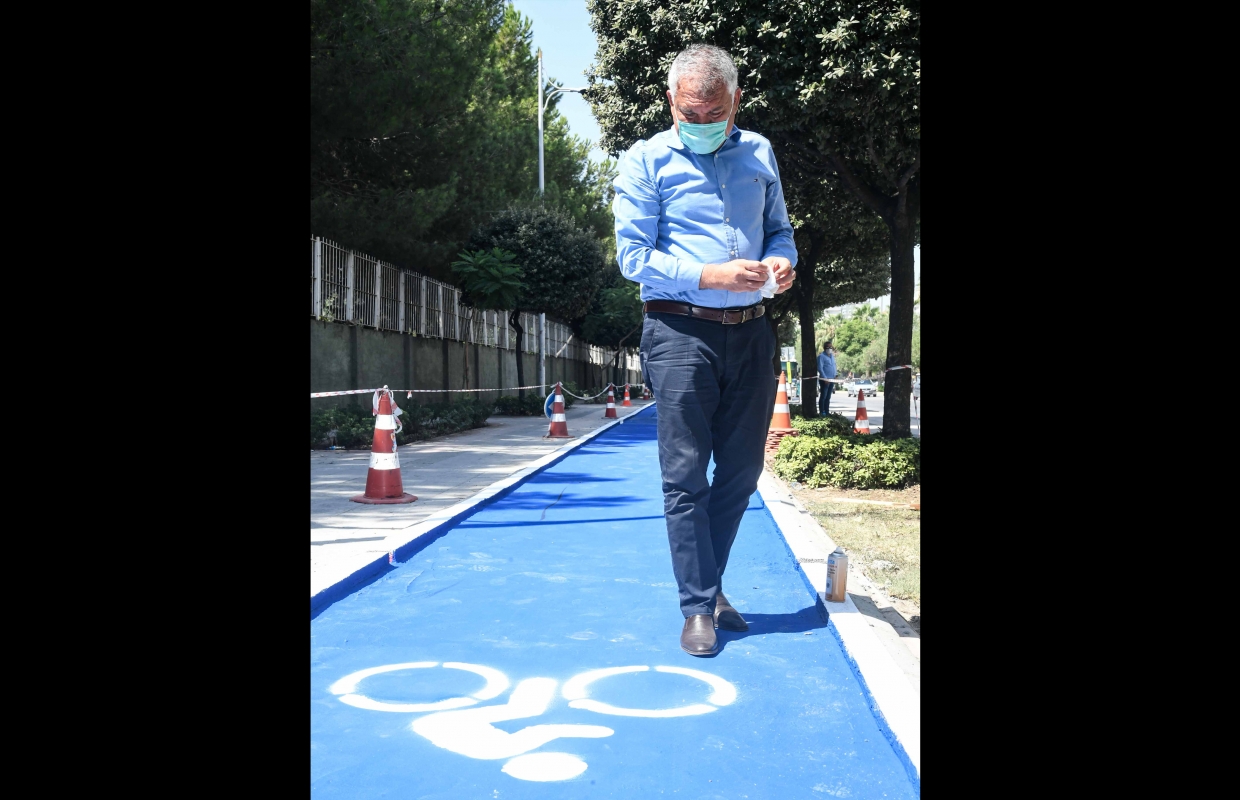 Bisiklet yollarında zemin uygulaması biten bölümlerin ilk boya işlemini Başkan Zeydan Karalar kendi elleriyle yaptı.