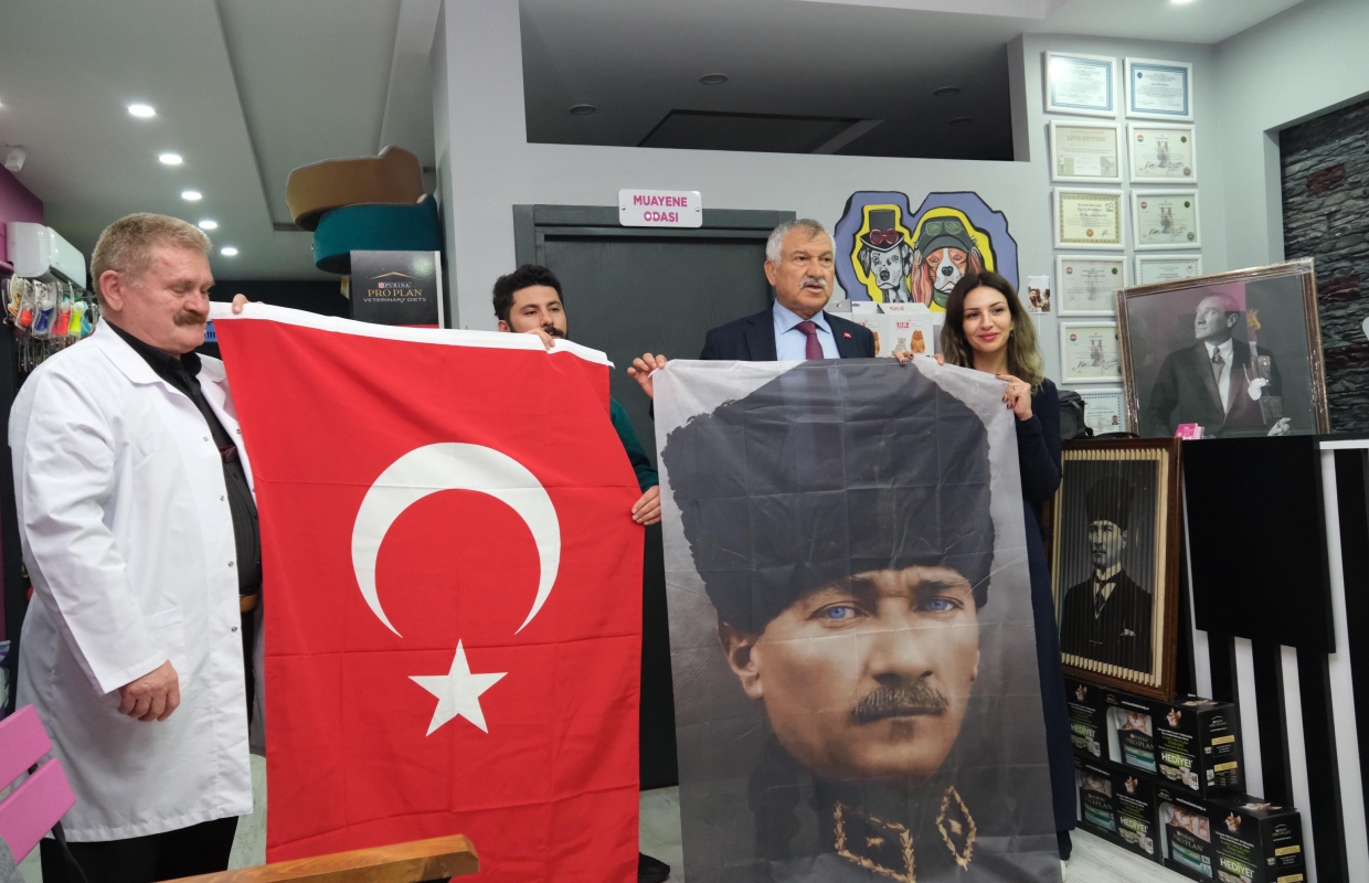 Başkan Zeydan Karalar, kliniklerinde Mustafa Kemal Atatürk’e hakaret edilen veteriner teknisyenine ve klinik sahibine Atatürk posteri, Atatürk flaması ve Türk Bayrağı hediye etti.