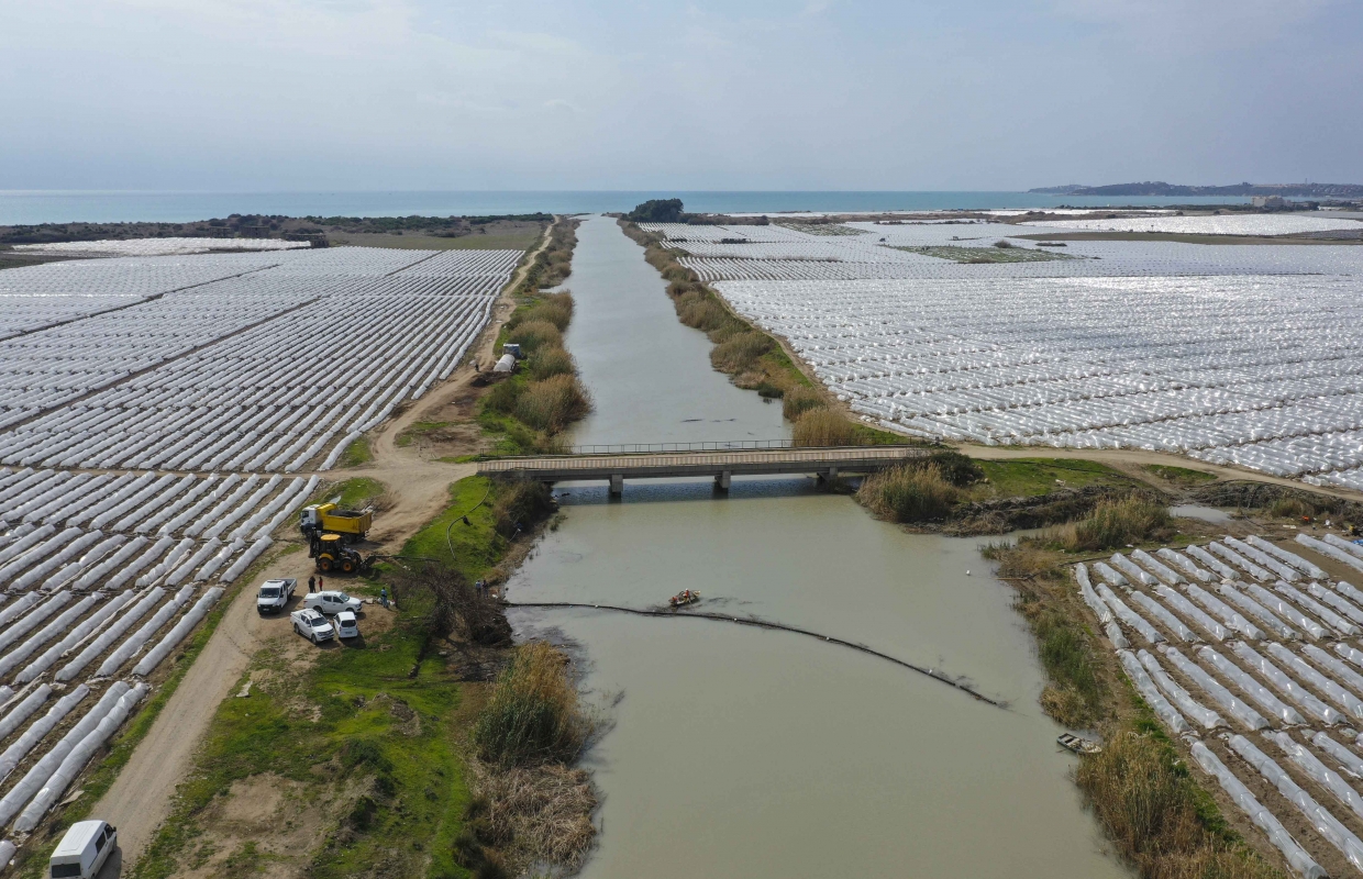 Karataş’a bağlı Bahçe Köyü YD2 Drenaj Kanalı’nda kurduğu yüzer katı atık