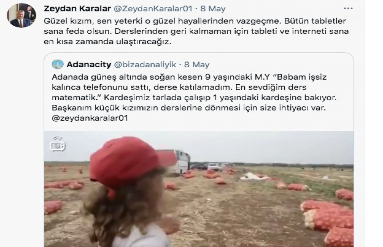 Adana Büyükşehir Belediyesi ihtiyacı alan vatandaşlara, Ramazan Bayramı öncesinde alışveriş kartı dağıttı. Sağlık ve Sosyal Hizmetler Daire Başkanlığı ile Derman ekiplerince bebek bakım seti dağıtımı da yapıldı. Başkan Zeydan Karalar, derslerine katılamadığını söyleyerek kendisinden destek isteyen tarım işçisi ailenin 9 yaşındaki kızı M.Y’ye tablet ve internet gönderdi.