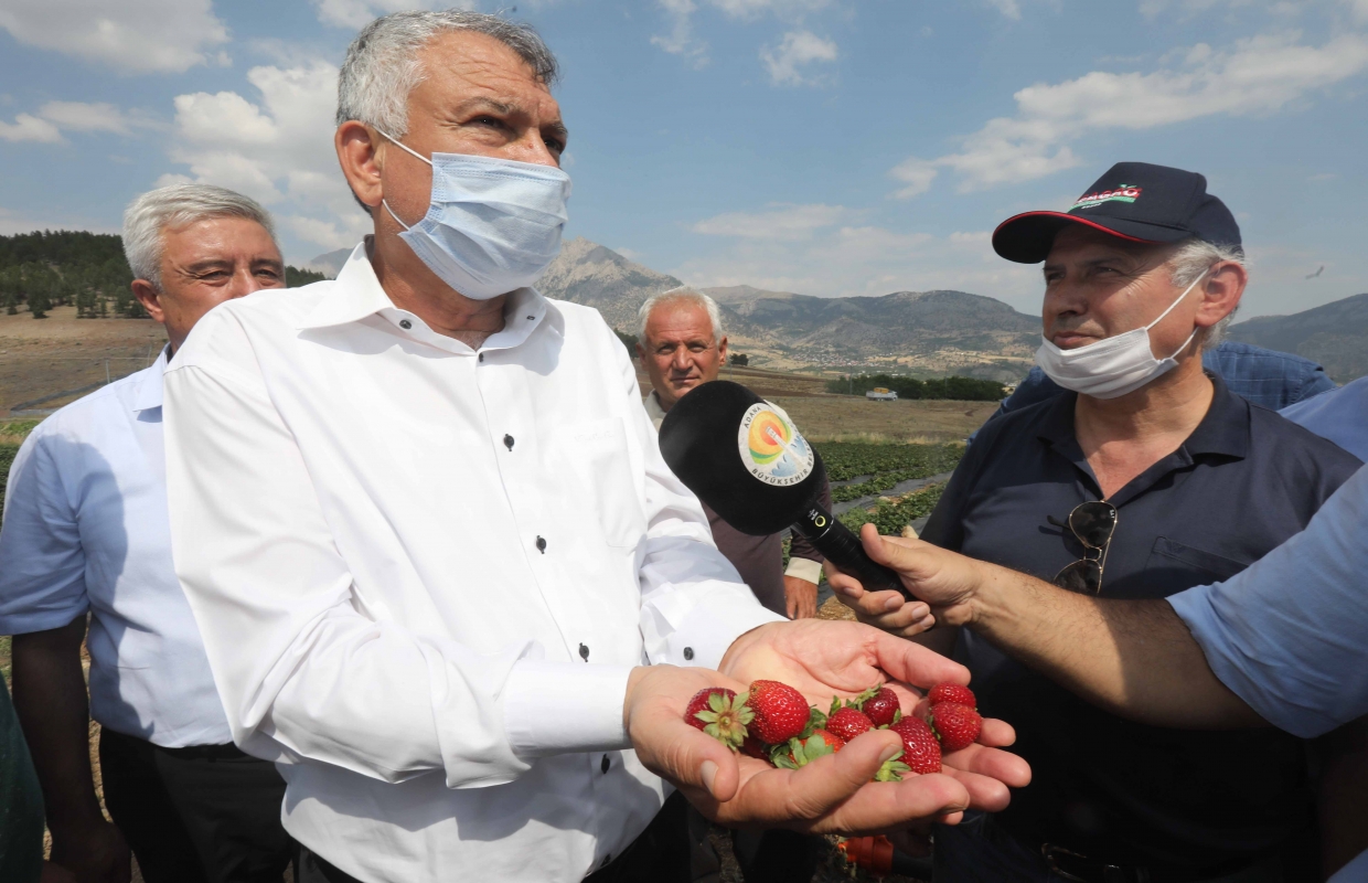 çilek fideleriyle üretim yapan çiftçileri sahada ziyaret etti. Üreticiler