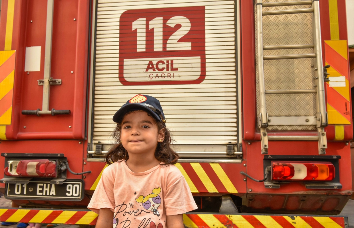 ilgiyle dinleyen, itfaiye araçlarını inceleyen minikler, kendilerine yöneltilen