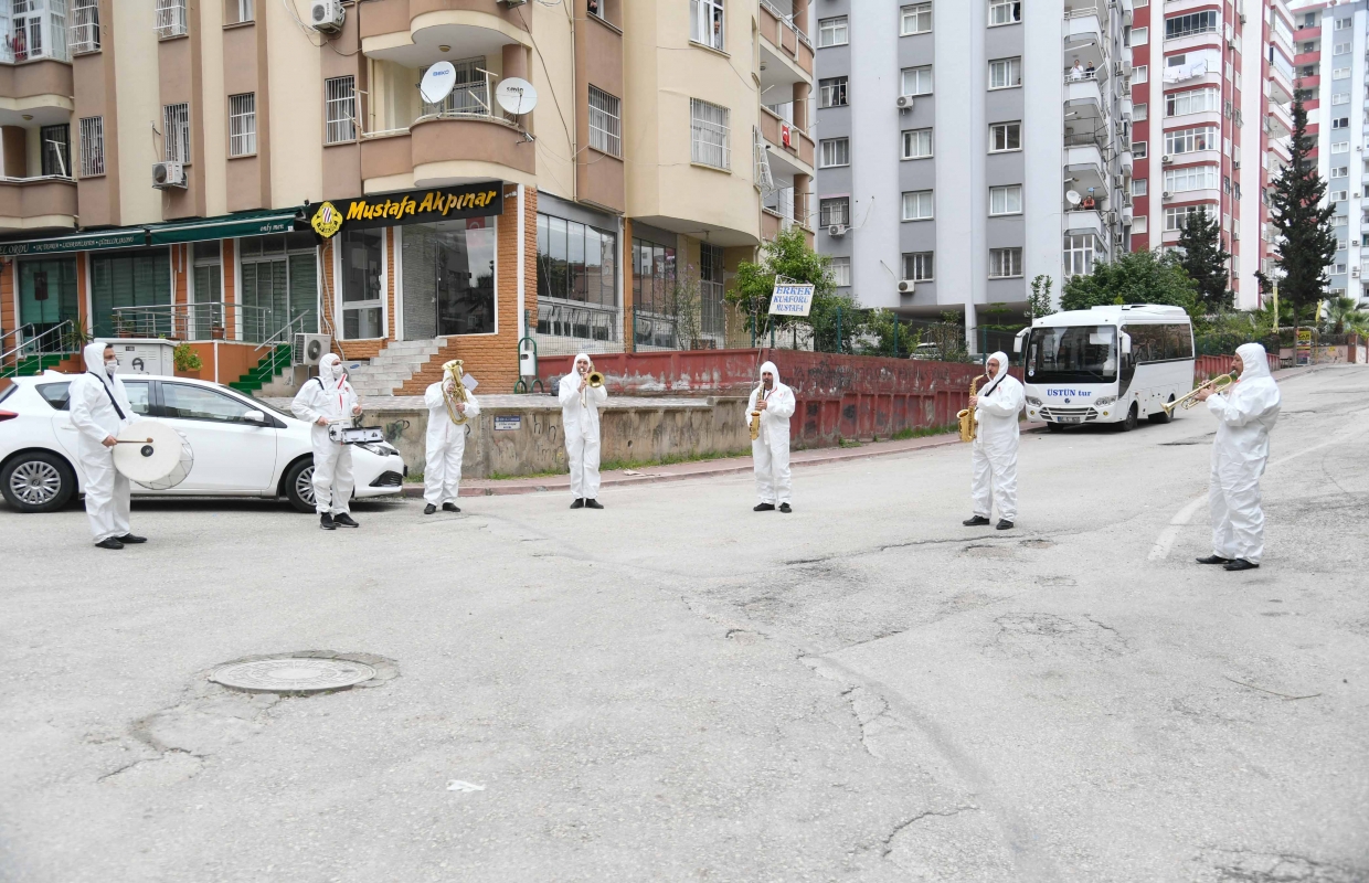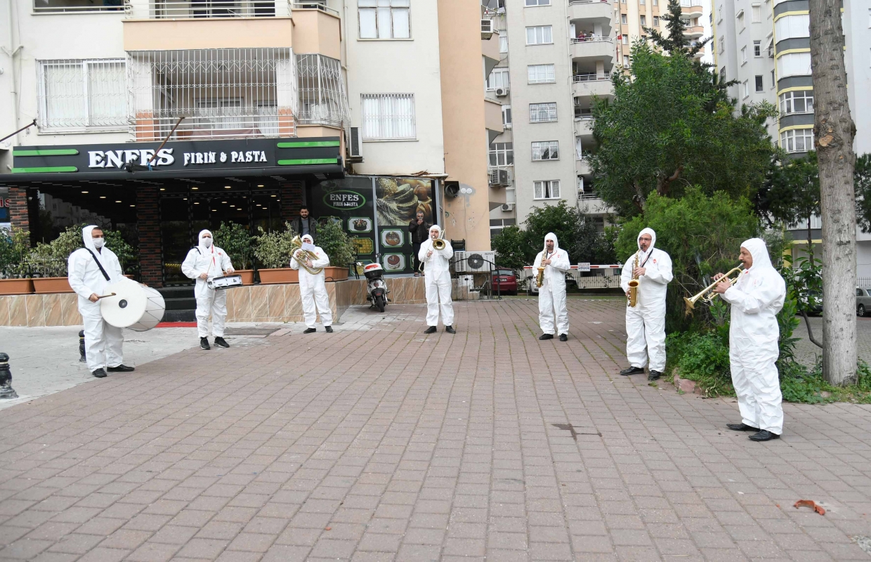 Adana Büyükşehir Belediye Bandosu ise halka moral vermek için sokaklarda kısa resitaller veriyor.