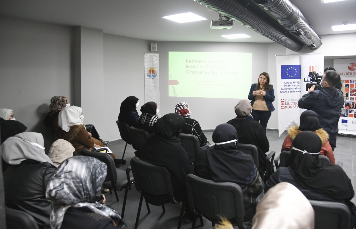 Kentsel Hizmetlere Erişim ve Toplumsal Cinsiyet Eşitliği Atölyesi' de Hayata Destek Derneği'nden avukat ve sosyal çalışmacı tarafından eğitim, kayıt, eğitim, sağlık ve barınma gibi konuların yanı sıra adalete erişim, koruma hukuku ve aile hukuku gibi yasal konuları aktarılarak temel haklara ve hizmetlere erişmeleri için gerekli bilgilendirme yapıldı.