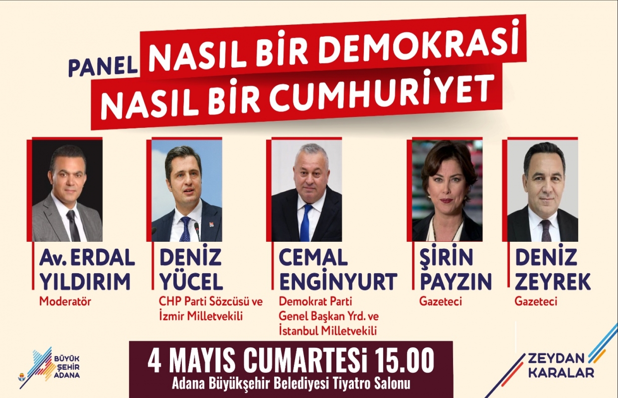 Nasıl Bir Demokrasi Nasıl Bir Cumhuriyet konulu panel, 4 Mayıs Cumartesi günü, saat 15’te, Adana Büyükşehir Belediyesi Tiyatro Salonu’nda gerçekleştirilecek. Moderatörlüğünü Av. Erdal Yıldırım’ın üstleneceği panelde; CHP Parti Sözcüsü ve İzmir Milletvekili Deniz Yücel, DP Genel Başkan Yardımcısı ve İstanbul Milletvekili Cemal Enginyurt, Gazeteciler Şirin Payzın ile Deniz Zeyrek konuşma yapacak.