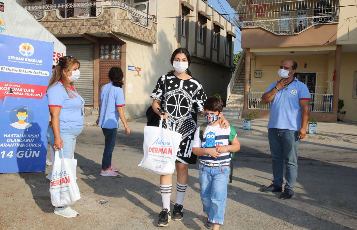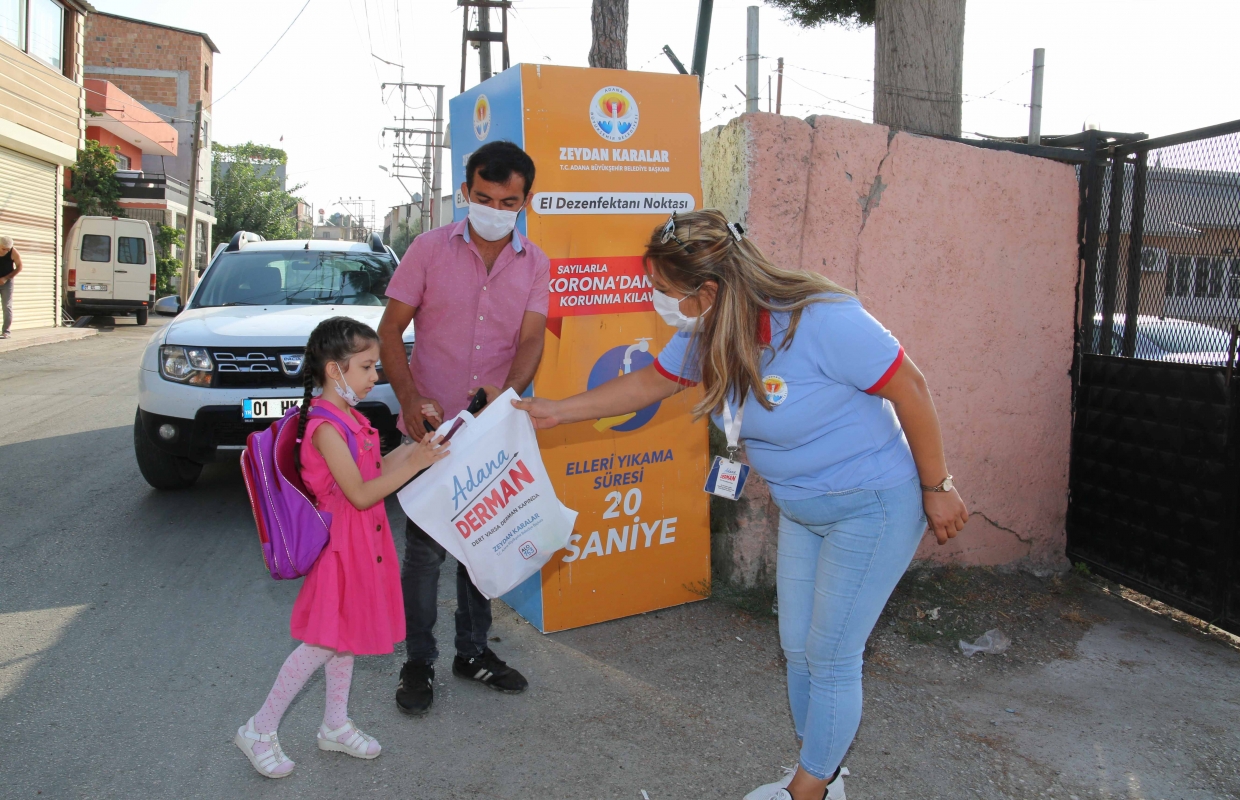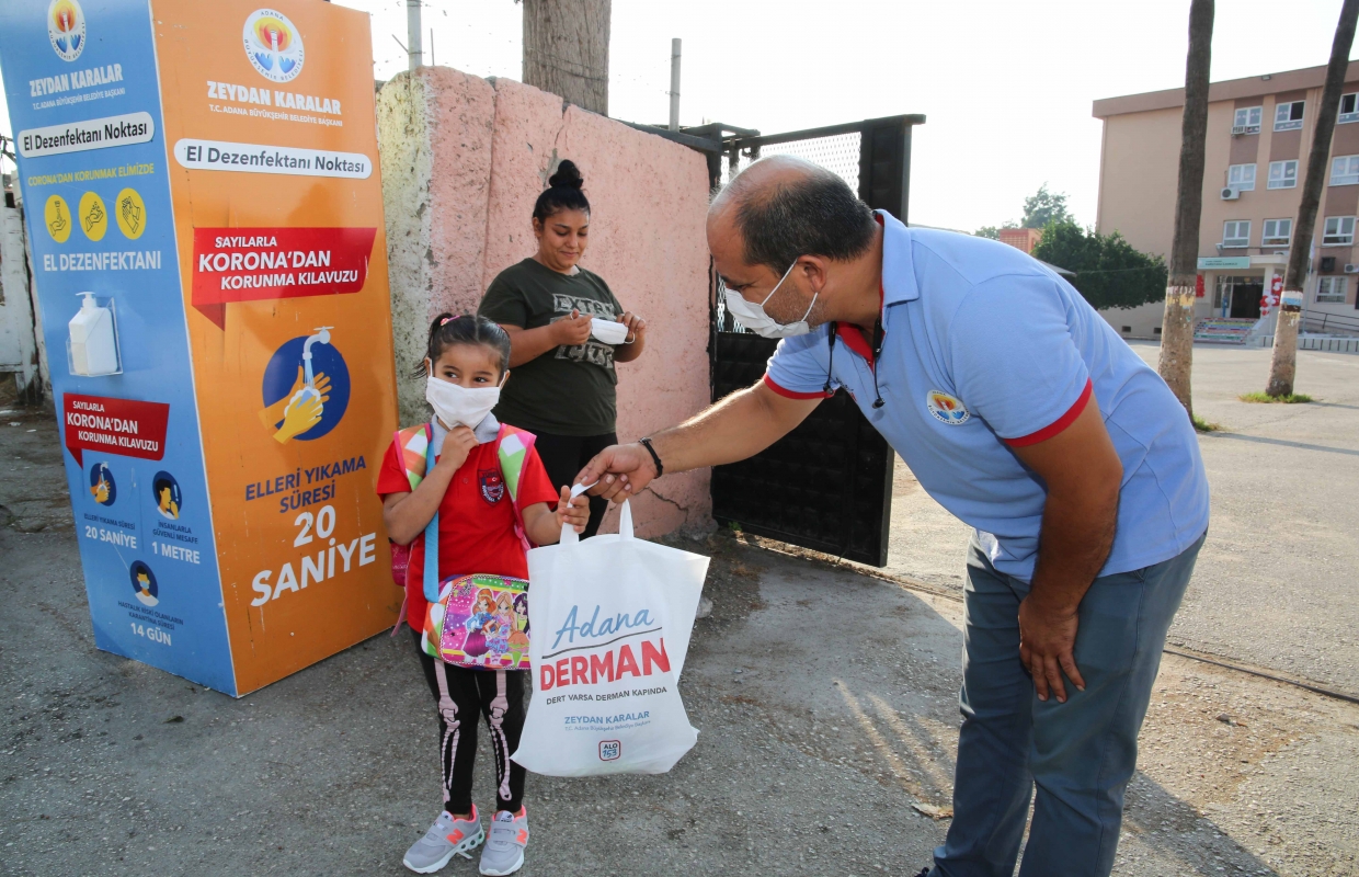 Adana Büyükşehir Belediyesi; kısıtlı sınıflarla da olsa ilk ders zilinin çalmasıyla okullarda dezenfekte işlemi gerçekleştirip, okul önlerine el dezenfektanı stantları kurarak öğrencilere maske ve çeşitli hediyeler dağıttı.