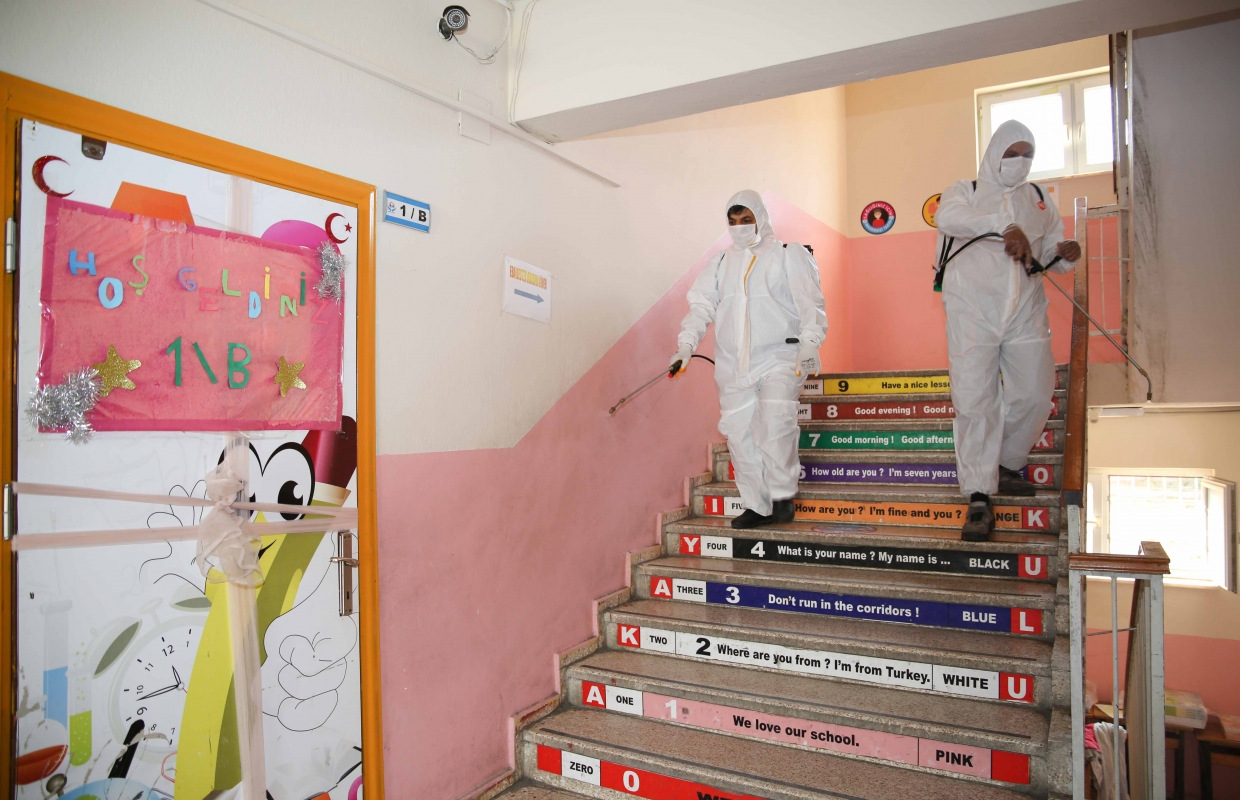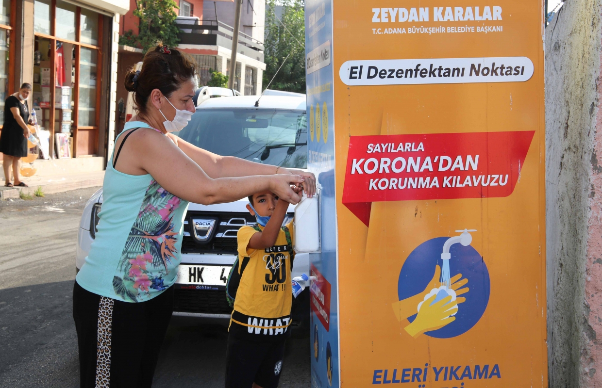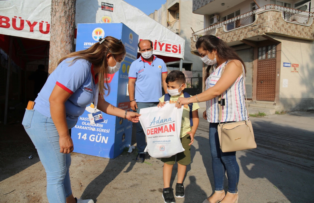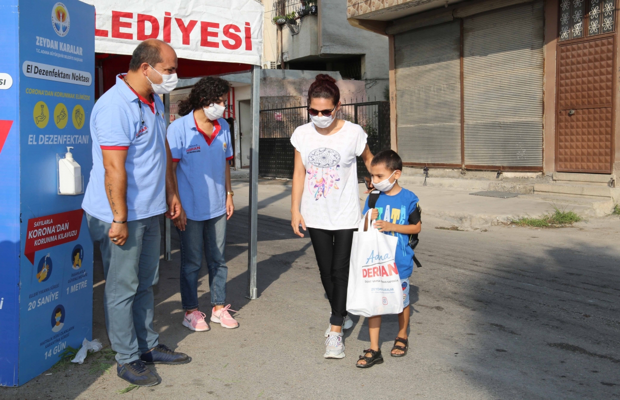 Adana Büyükşehir Belediyesi; kısıtlı sınıflarla da olsa ilk ders zilinin çalmasıyla okullarda dezenfekte işlemi gerçekleştirip, okul önlerine el dezenfektanı stantları kurarak öğrencilere maske ve çeşitli hediyeler dağıttı.