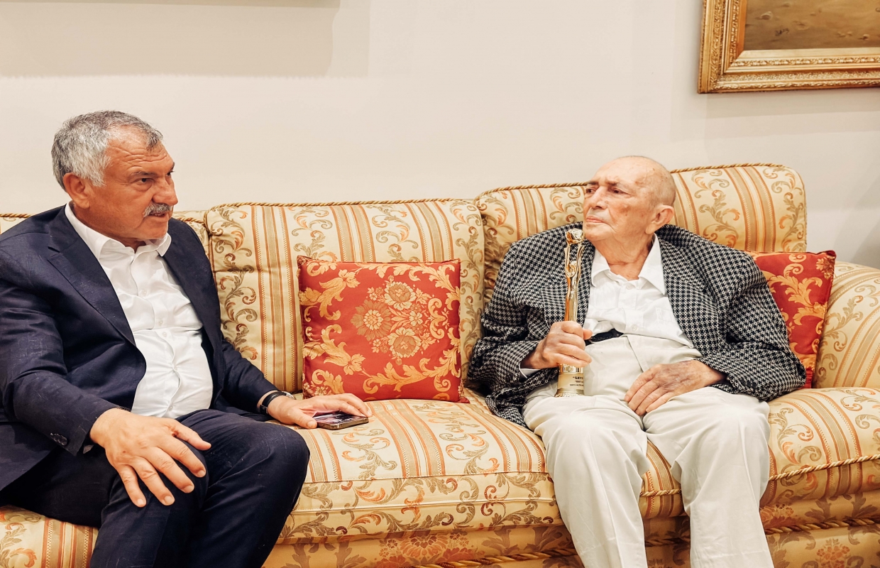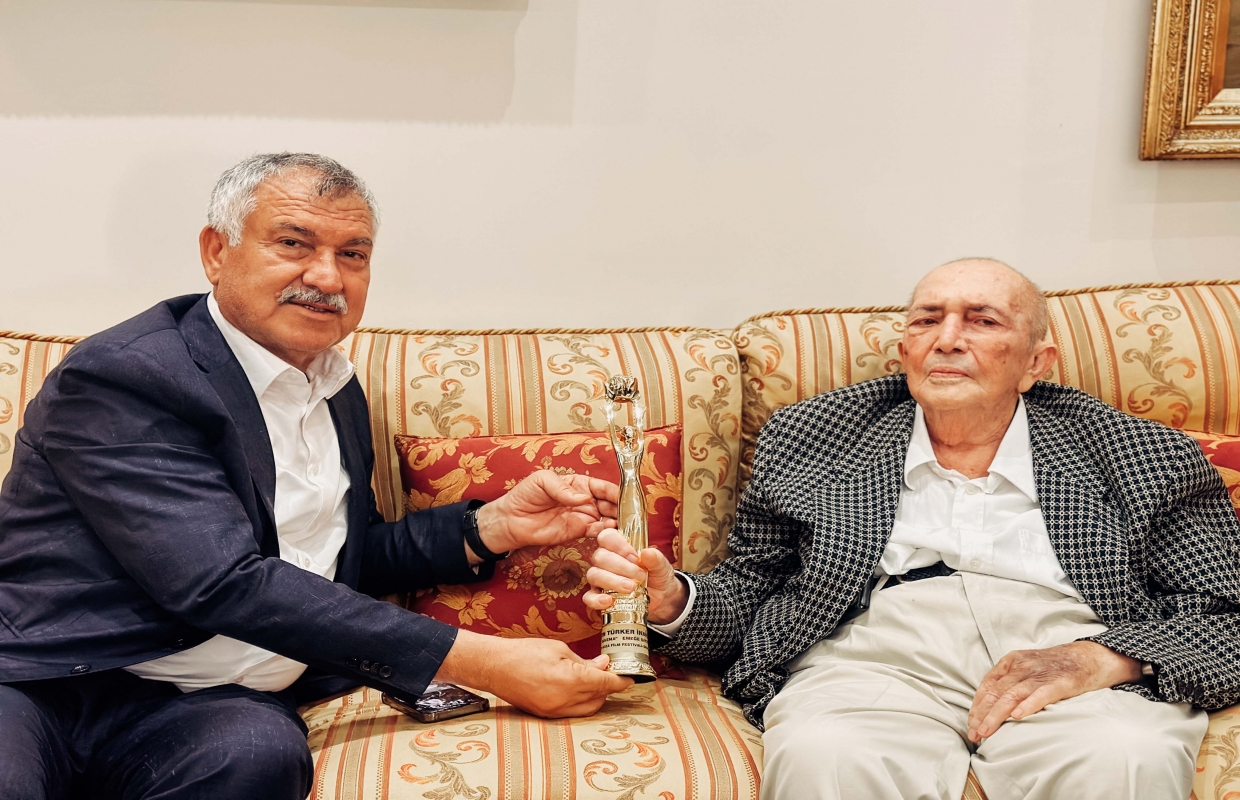 Zeydan Karalar, Bay Sinema olarak bilinen, 87 yaşındaki Türker İnanoğlu’nu TÜRVAK’ta ziyaret etti, Altın Koza’da almaya gelemediği plaketini sundu, sohbet etti.