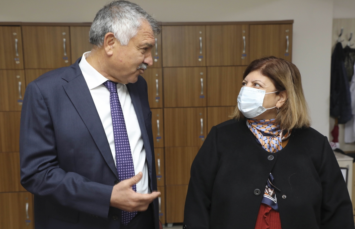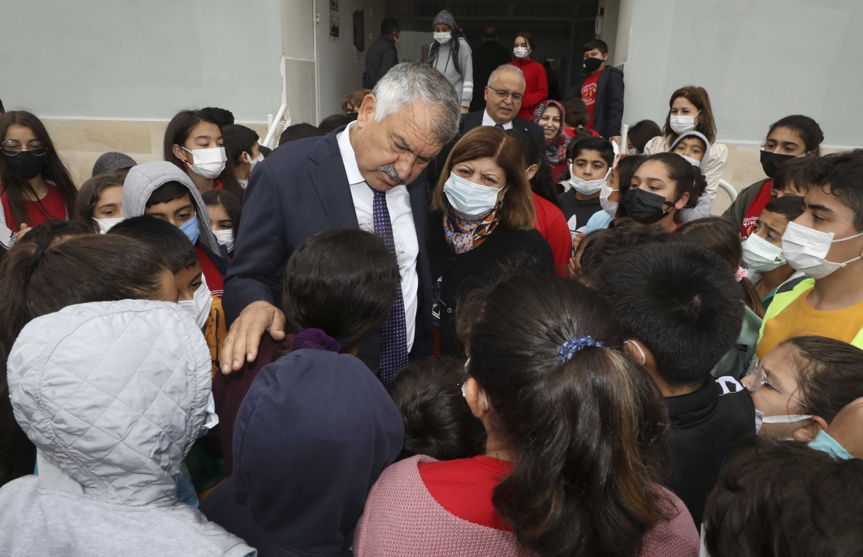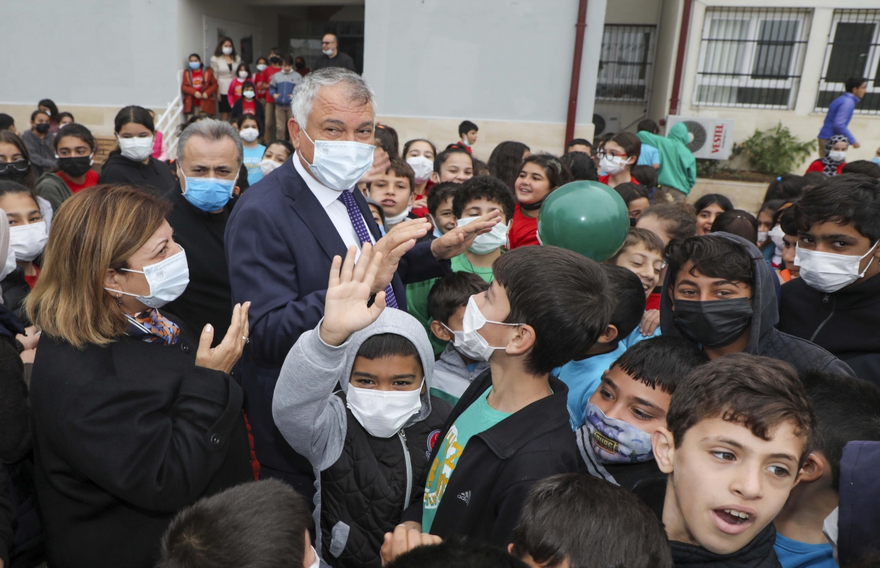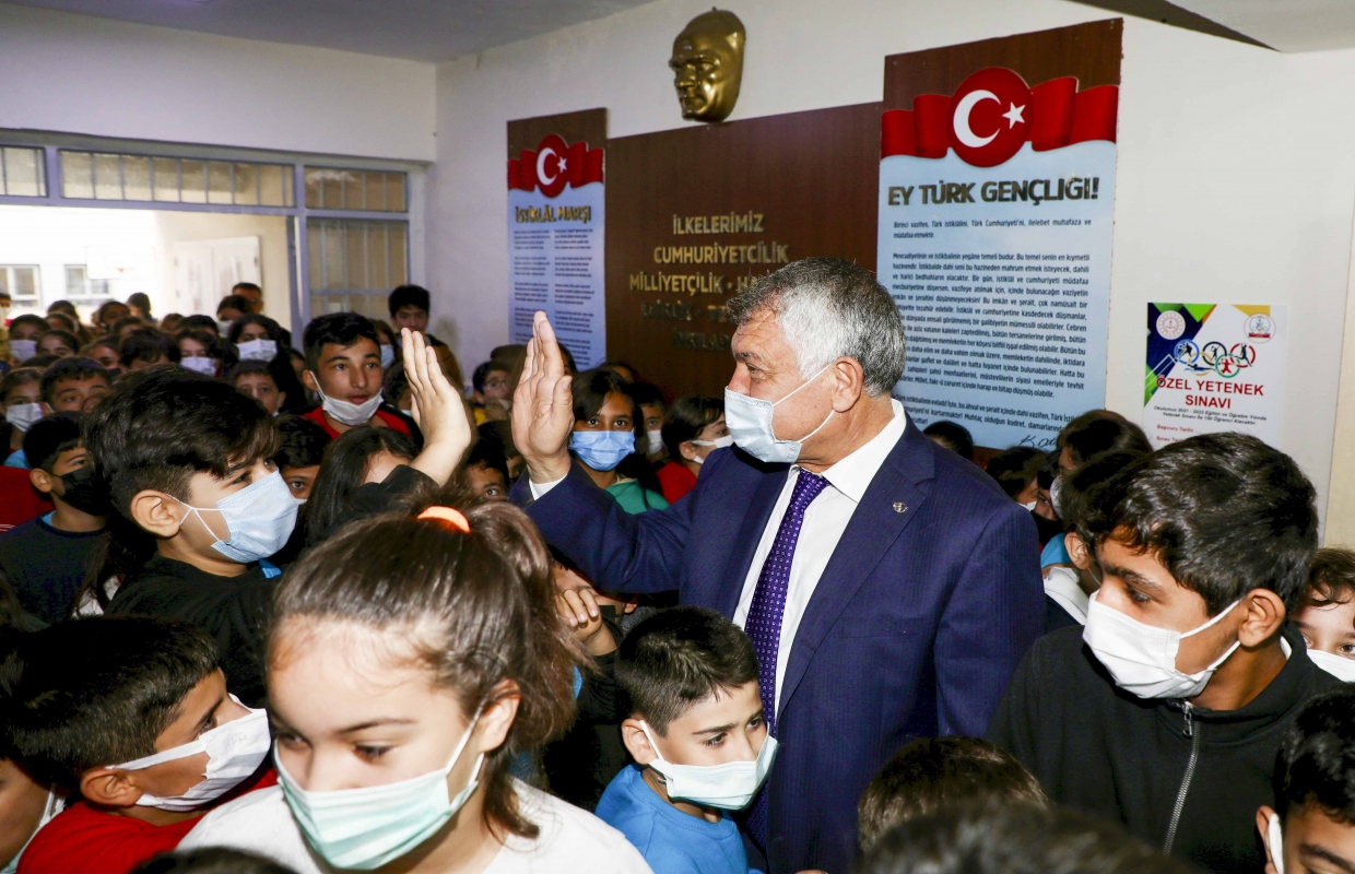 Öğretmenler odasında öğretmenlerle sohbet eden ve sorunlarını dinleyen Başkan Zeydan Karalar, okuldan ayrılırken öğrencilerle de sohbet etti.