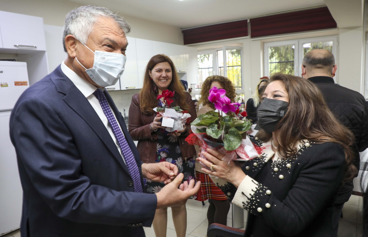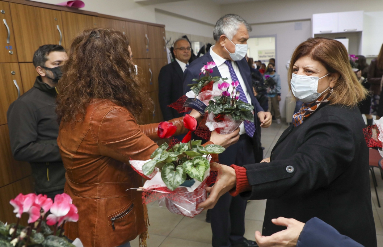 Karalar ve Nuray Karalar, öğretmenlere çiçek sundu.